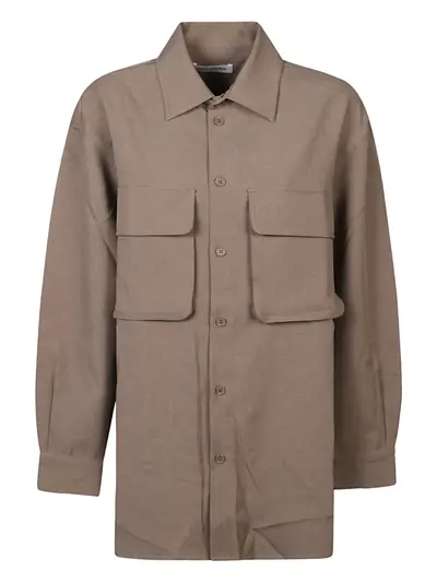beige double patch pockets button front fastening long sleeves buttoned cuffs collared neck