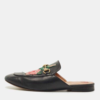 Gucci Black Leather Rose Embroidered Princetown Horsebit Flat Mules Size 39 1209389 (чёрный, lpn30899183)