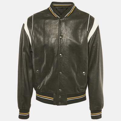 This Givenchy bomber jacket brings a sleek twist to a classic silhouette. Crafted from smooth black leather, it features a refined monogram detail that highlights the house’s signature identity. The ribbed trims and zip front closure maintain its sporty edge, while the luxurious finish elevates it into a statement outerwear piece.