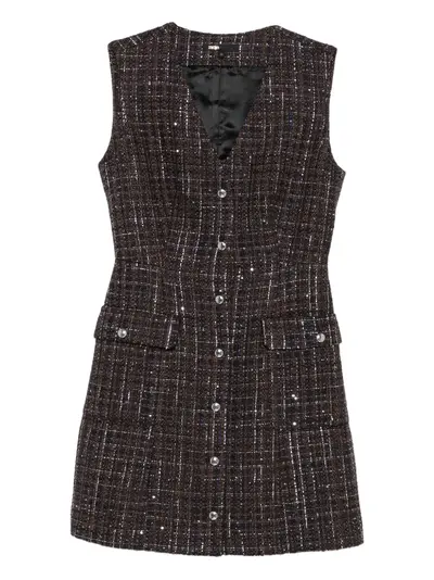 brown sequin embellishment button fastening sleeveless V-neck flap pockets tweed design