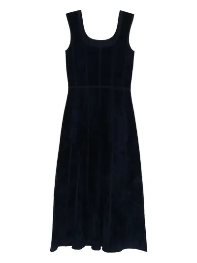 navy blue sleeveless square neck fitted bodice flared skirt side slit pockets