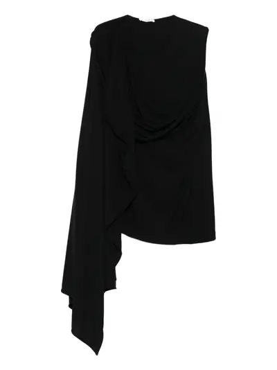 black draped neckline asymmetrical hem one-shoulder design sleeveless gathered fabric