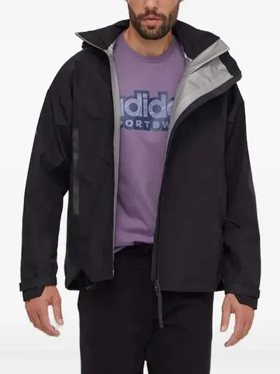 black three stripes detail zip fastening hooded neck adjustable hood long sleeves