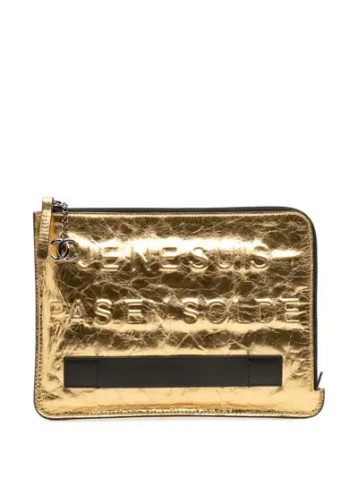 metallic lambskin leather body top zip closure exterior back slip pocket interior zip and slip pockets gold Serial Number: 21051386 Inclusions: authenticity card. Condition: EXCELLENT. This previously owned item is in near-perfect condition with no signs of damage or use. Please refer to the photos on this product page for a detailed view of the item, including any damages declared.