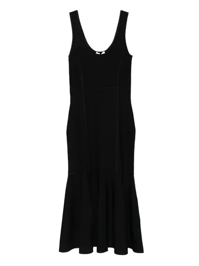 black seamed bodice sleeveless round neck fitted silhouette flared hem