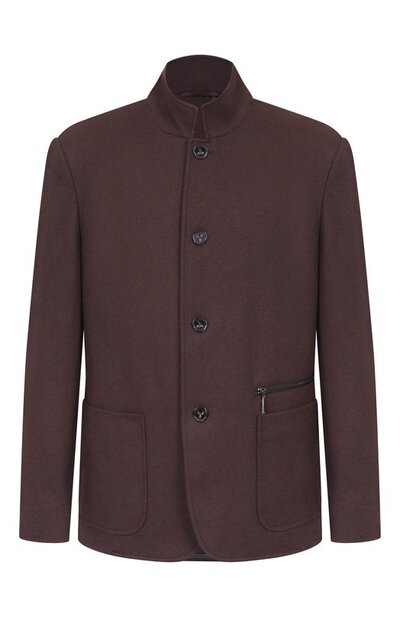 Пиджак с воротником-стойкой и парными шлицами сзади выполнили из шерстяного трикотажа с добавлением нейлона. Модель с внутренним карманом дополнили внешними — парой накладных и прорезным на молнии.