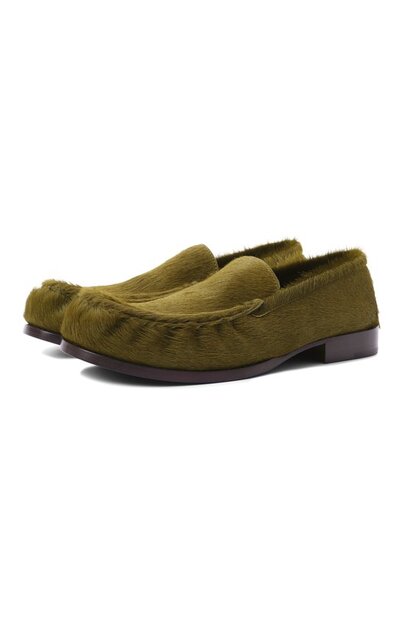 Лоферы с приподнятым квадратным мысом выполнили из шкуры теленка. Туфли с кожаным подкладом поставили на гибкую прорезиненную подошву с широким каблуком.