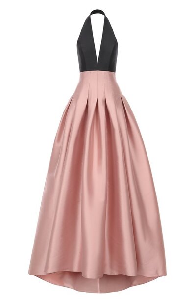 Макси-платье Mikado с шелковым подкладом сшили из атласа. Пышный подол со складками дополнили шлейфом. Модель с открытой спиной и глубоким V-образным вырезом застегивается потайной молнией сзади.