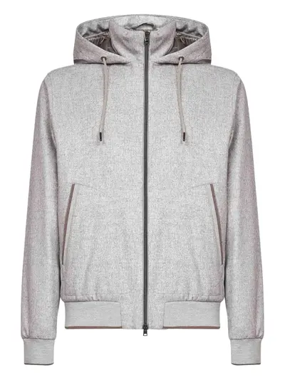 grey double-slider zip closure adjustable drawstring hood front pockets ribbed cuffs and hem
