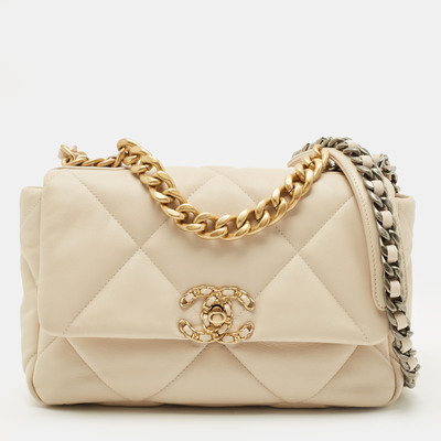 Since its debut, the Chanel 19 has stood as a modern reinterpretation of the house’s most iconic codes. This pre loved designer flap bag comes in light beige quilted leather, paired with mixed metal hardware and a supple leather and chain strap for shoulder or crossbody wear. Lined in durable nylon, it balances luxury with practicality, carrying Chanel’s spirit into everyday life.