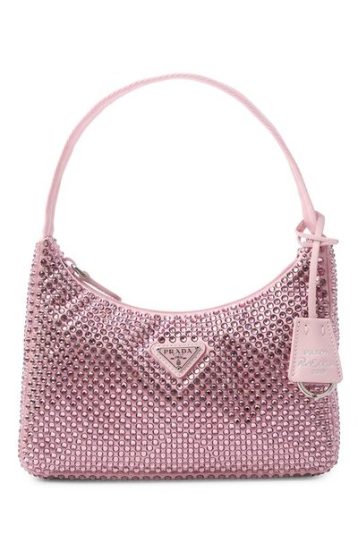 Сумку Re-Edition 2000 из атласа полностью покрыли миниатюрными стразами в тон. На принадлежность аксессуара марке указали фирменной треугольной пластиной, а на брелоке из сафьяновой кожи вытиснили логотип. Аксессуар с текстильной ручкой застегивается молнией.