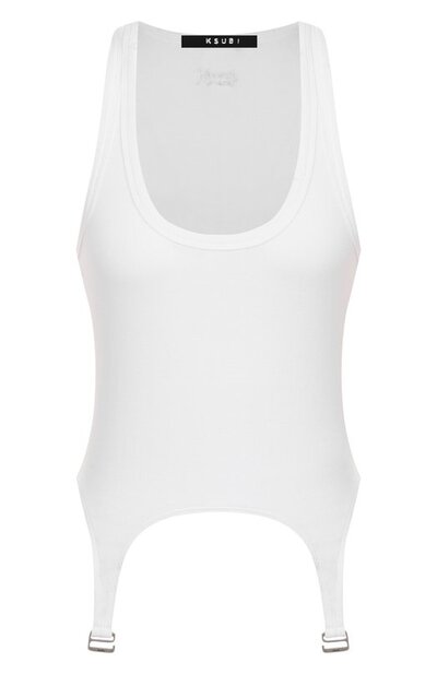 Майку с декоративными подвязками для чулок сшили из хлопкового эластичного трикотажа рибана. Модель с глубоким круглым вырезом украшена брендированной вышивкой в тон на спинке.
