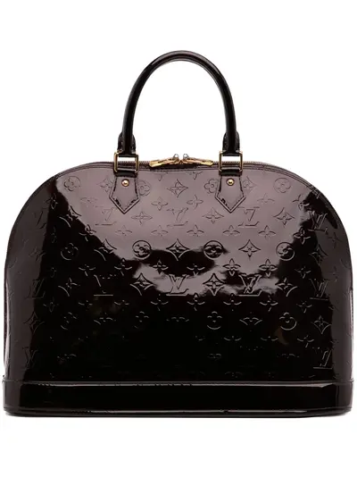 vernis body rolled handles gold-tone hardware top zip closure interior slip pockets purple Serial Number: MI3048 This item has no inclusions. Condition: GOOD. This previously owned and used item is in good condition with minimal signs of use. This may include fading of material or plating and scratches. Please refer to the photos on this product page for a detailed view of the item, including any damages declared.