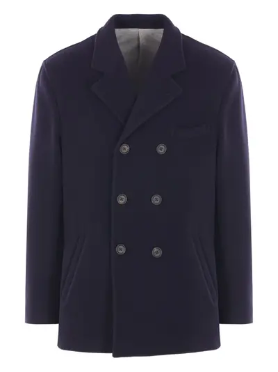 navy blue double-breasted closure welt pockets buttoned cuffs back vents branded buttons