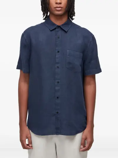 navy blue short sleeves button fastening classic collar chest patch pocket linen