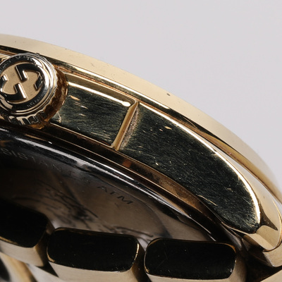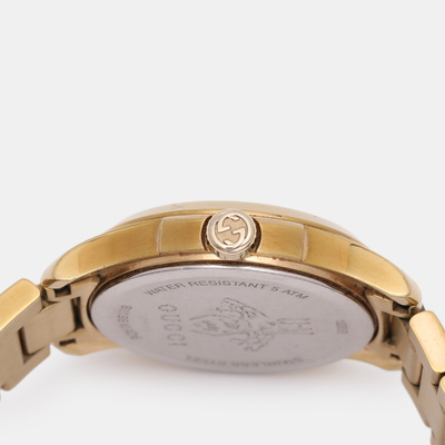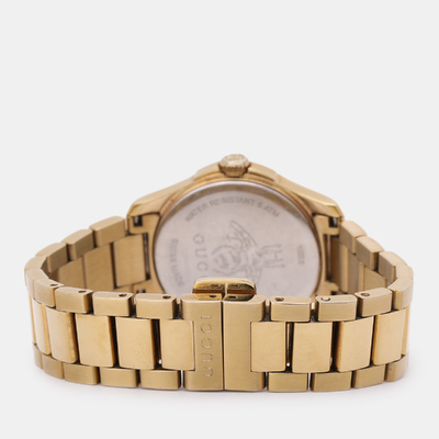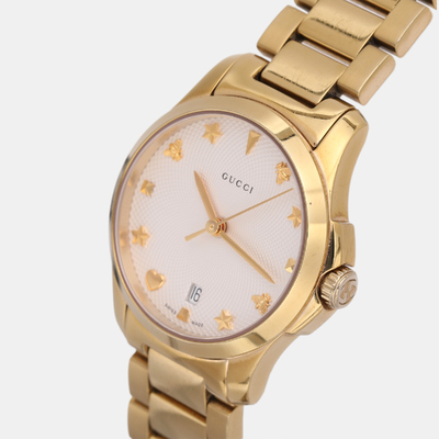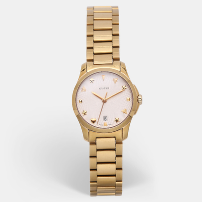 An elegant expression of timekeeping, this Gucci G Timeless watch features a cream dial housed in gold plated stainless steel. Sleek and feminine, its 28 mm case makes it a versatile everyday accessory with a touch of luxury.