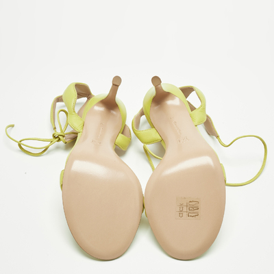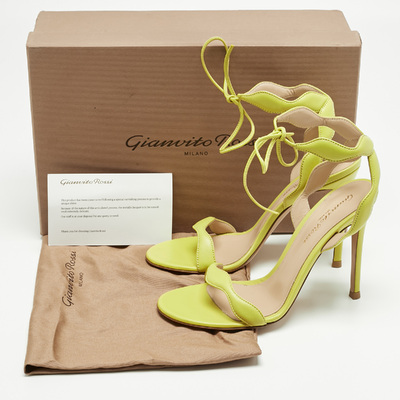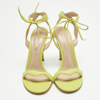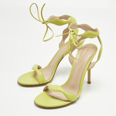 Step into a world of elegance with these vibrant green ankle tie sandals. Crafted meticulously in Italy by Gianvito Rossi, these sandals exude sophistication. The wavy design delivers high appeal, while the leather wraps your foot in utmost comfort, ensuring every stride is graceful.