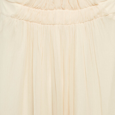 Celine’s beige silk mini dress gathers softly to create movement around the frame. Minimalist yet sensual, it evokes candlelit dinners and sunlit afternoons, a fluid slip of a dress that captures the maison’s understated glamour.
