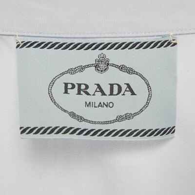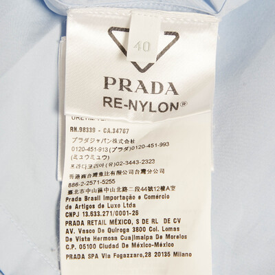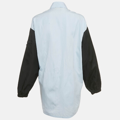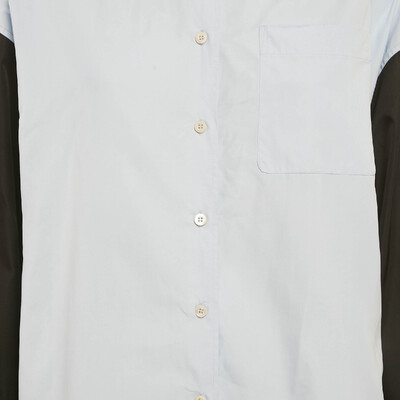 Prada combines cotton with nylon sleeves in a blue and black button down shirt dress that feels both utilitarian and refined. Clean lines and subtle contrast hint at uniforms reimagined for modern life — a piece that can be styled for work, layered for travel, or worn alone as a quiet statement of ease.