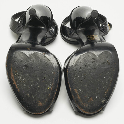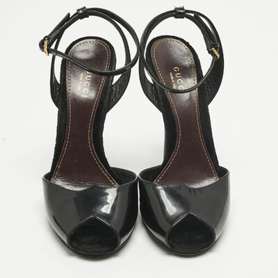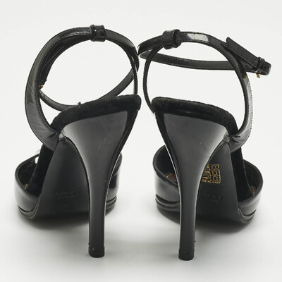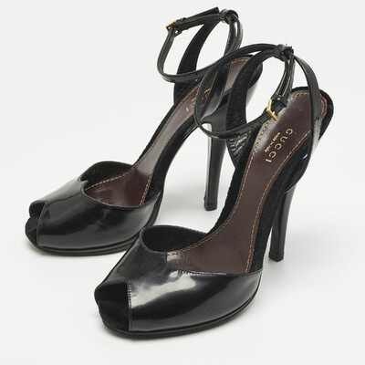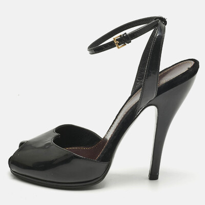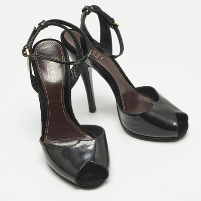 Patent black leather shaped into a peep toe heel with ankle closure. They belong to midnight dinners, hotel lobbies lit in gold, and moments when simplicity holds the most allure.