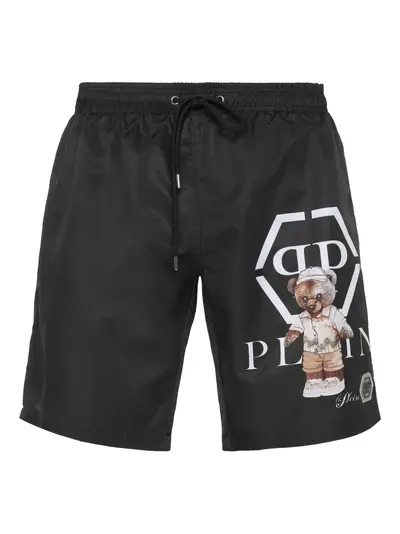 black teddy bear print drawstring fastening logo emblem side pockets Be mindful to try on swimwear over your own garments.