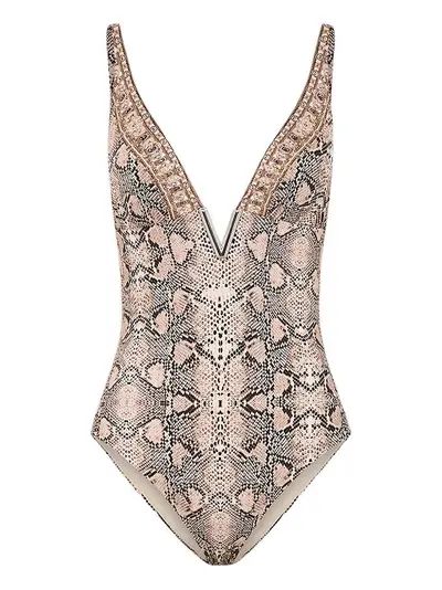 beige/multicolor all-over snake print v-neck shoulder straps Be mindful to try on swimwear over your own garments.