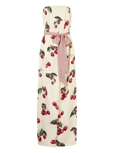 beige/multicolor silk cherry-print strapless straight leg rear zip fastening