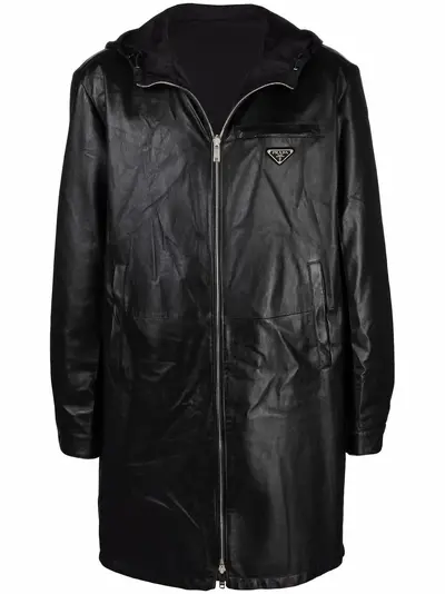 black leather/Re-Nylon enamel triangle logo classic hood front zip fastening long sleeves two side slit pockets mid-length