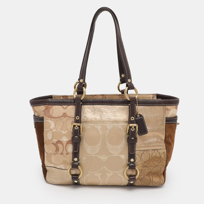 This authentic Coach tote that feels like a story stitched together—signature canvas meeting suede and leather in rich golden tones. Its patchwork design makes it stand out, while the generous space inside keeps pace with everything your day demands.