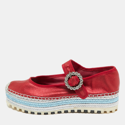 Playful yet dramatic, these Marc Jacobs Suzi espadrille platforms stand out in metallic red nubuck. The Mary Jane strap and crystal brooch detail add whimsical femininity.