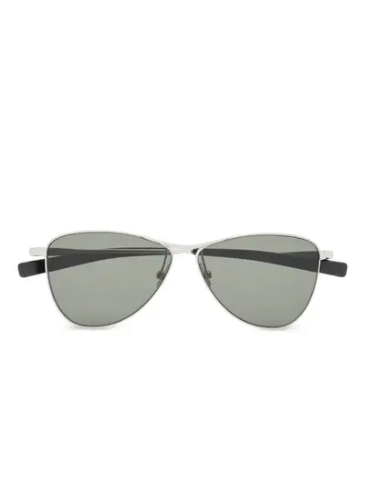 silver grey lenses thin metal arms streamlined design subtle branding These glasses come with a protective case.