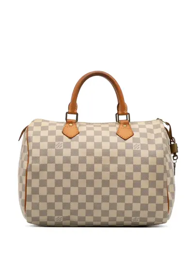 damier azur canvas body rolled vachetta leather handles top zip closure interior slip pocket white Serial Number: DU3161 Inclusions: padlock, key. Condition: GOOD. This previously owned and used item is in good condition with minimal signs of use. This may include fading of material or plating and scratches. Declared Damages: Interior Pocket Feature(s) Minor Loose Stitching. Please refer to the photos on this product page for a detailed view of the item, including any damages declared.