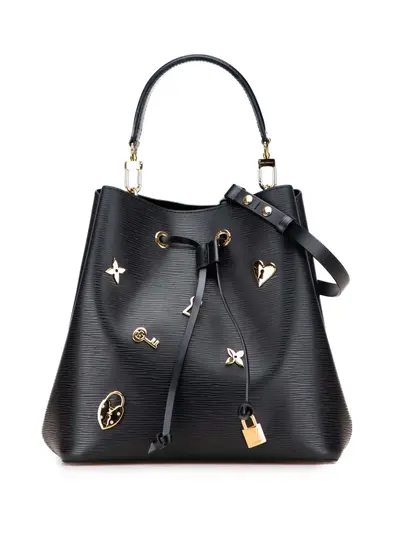 epi leather body with charms removable handle detachable flat leather strap top drawstring closure interior zip pocket black Serial Number: SR4178 Inclusions: shoulder strap. Condition: GOOD. This previously owned and used item is in good condition with minimal signs of use. This may include fading of material or plating and scratches. Declared Damages: Handle/Strap Feature(s) Minor Loose Stitching. Please refer to the photos on this product page for a detailed view of the item, including any damages declared.