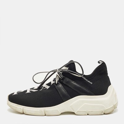 Prada combines innovation with minimalism in these lace up sneakers. Crafted in black knit fabric with leather accents, they offer a snug, flexible fit while maintaining sleek sophistication.