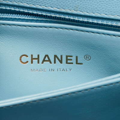 Chanel in a softer mood: sky blue caviar leather, a petite top handle, and the authority of something instantly recognized but never loud.