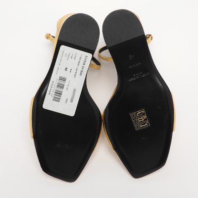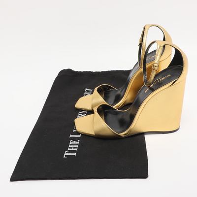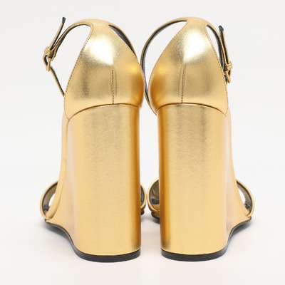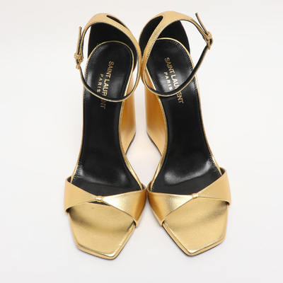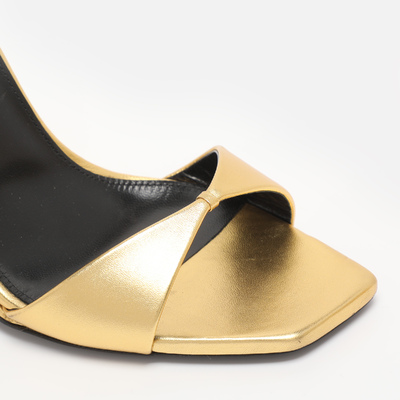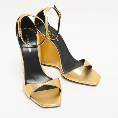 Gold metallic leather and a slim ankle strap give Saint Laurent’s Dare sandals a sleek, high impact finish. The clean lines offset the shine for a balanced evening shoe. They style perfectly with black tailoring or jewel toned gowns.