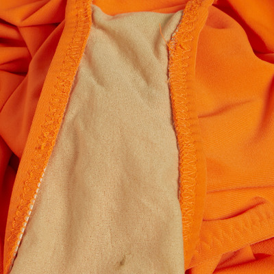 Norma Kamali’s iconic Diana dress appears here in orange jersey with signature ruching. The one shoulder cut sculpts the body while allowing ease of movement. It captures the designer’s blend of glamour and comfort.