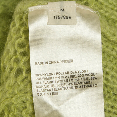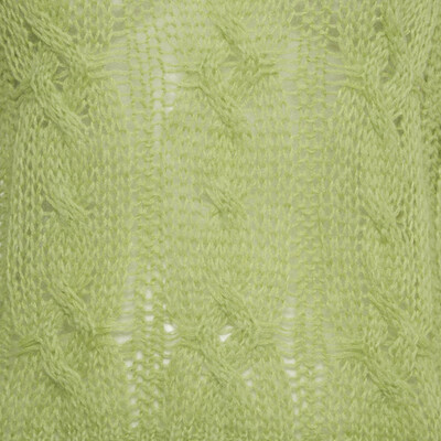 The Acne Studios lime green sweater features an elongated fit with dropped shoulders and uneven lines. The cable knit pattern adds texture and detail, letting the vibrant color stand out.