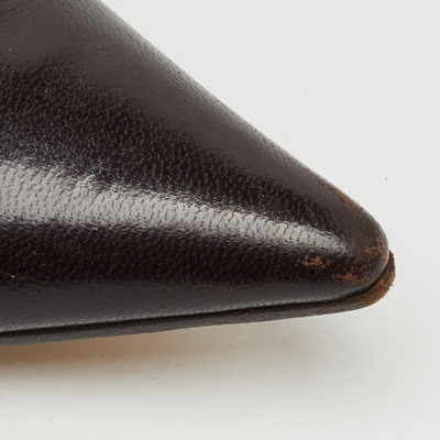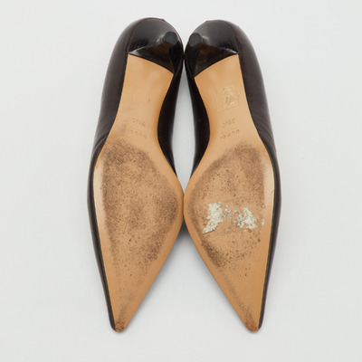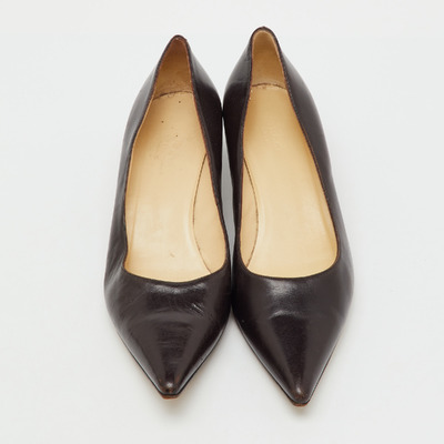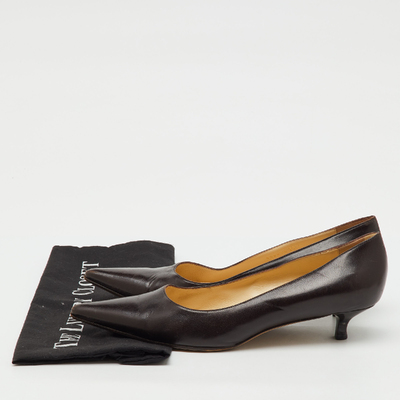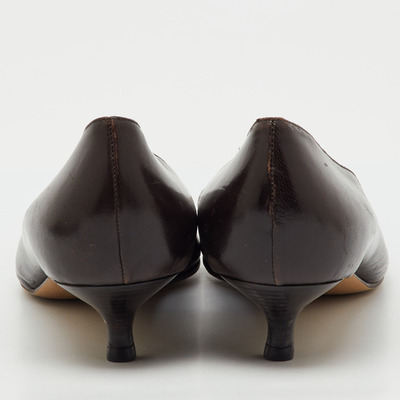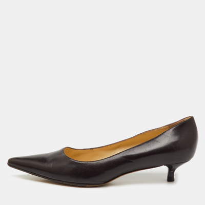 Dark brown leather and a pointed toe give these Gucci kitten heels a timeless profile. The low heel keeps them practical while still refined. A go to pump for both office looks and evening outfits.