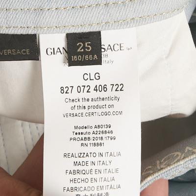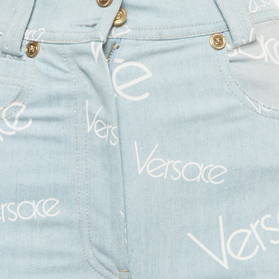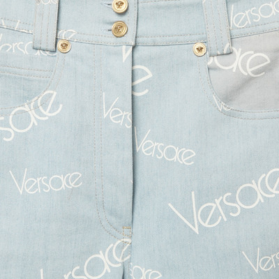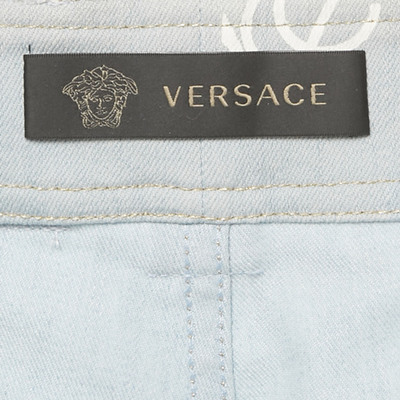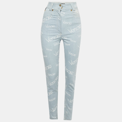 Blue denim printed with the Versace logo turns a classic skinny jean into a branded statement. The streamlined shape keeps the bold motif wearable. This pair ranks high in searches for Versace logo jeans.