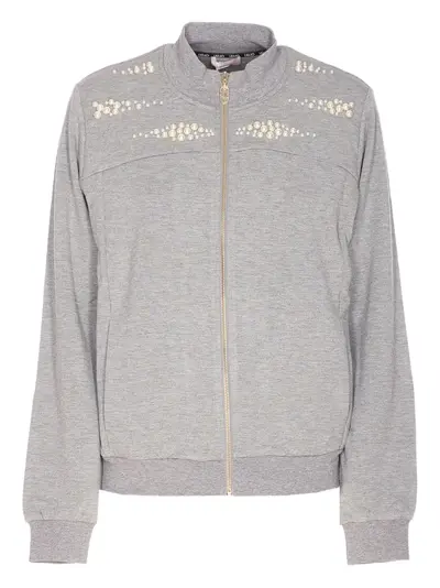 grey front zip fastening pearl embellishment long sleeves ribbed cuffs and hem