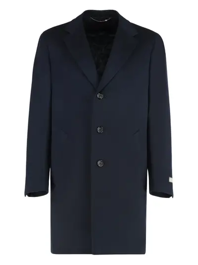 dark blue button fastening notched lapels long sleeves welt pockets straight hem