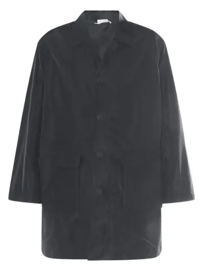 grey front button fastening side flap pockets long sleeves rear logo print