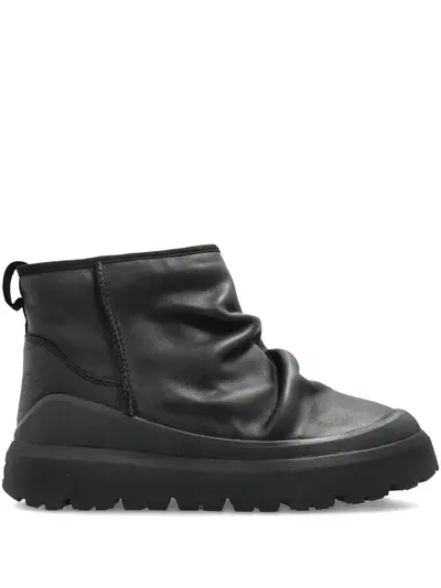 black leather upper ruched detailing pull-tab at the heel round toe ridged rubber sole