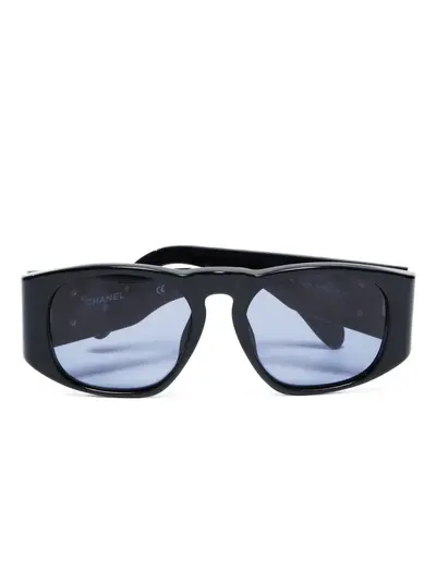 1990-2000s black geometric frame CC logo quilted effect tinted lenses nose pads These glasses come with a protective case. Condition: GOOD. This previously owned and used item is in good condition with minimal signs of use. This may include fading of material or plating and scratches.