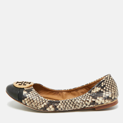 Tory Burch Minnie flats feature beige and brown python embossed leather for textured sophistication. The classic ballet silhouette ensures timeless elegance. Ideal for casual chic or polished daytime looks.