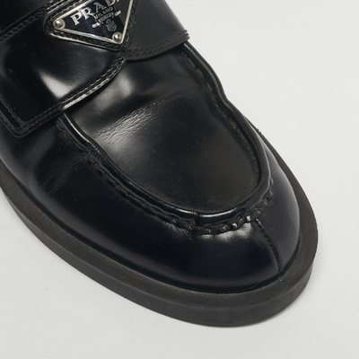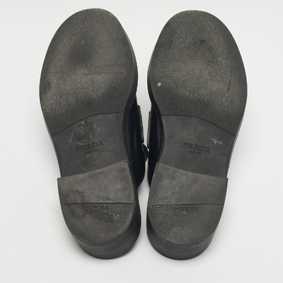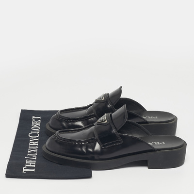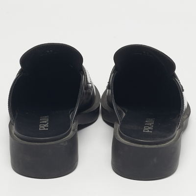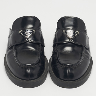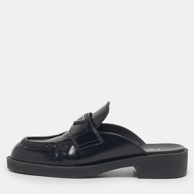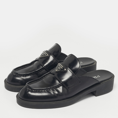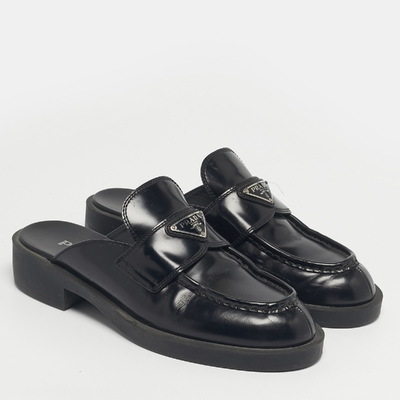 Prada’s black mules feature brushed leather adorned with the iconic logo. The slip on design balances comfort with understated luxury. A versatile pair for both office and chic casual looks.