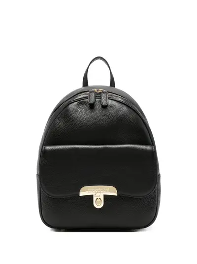 black leather top handle adjustable shoulder straps front flap pocket gold-tone hardware