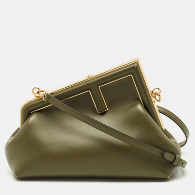 With a soft, sculpted form that fits naturally in your hand, the Small Fendi First Clutch in olive green leather feels like a signature of movement and style. Its iconic “F” clasp glints like a secret waiting to be discovered, while the compact interior, along with an adjustable strap, holds essentials effortlessly.