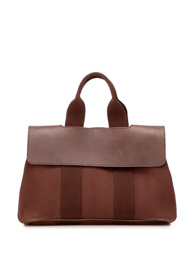 canvas body rolled handle leather top flap and snap button closure interior slip pocket brown Inclusions: pouch. Condition: GOOD. This previously owned and used item is in good condition with minimal signs of use. This may include fading of material or plating and scratches. Declared Damages: Exterior Back Feature(s) Moderate Scratches. Front Feature(s) Moderate Scratches. Please refer to the photos on this product page for a detailed view of the item, including any damages declared.